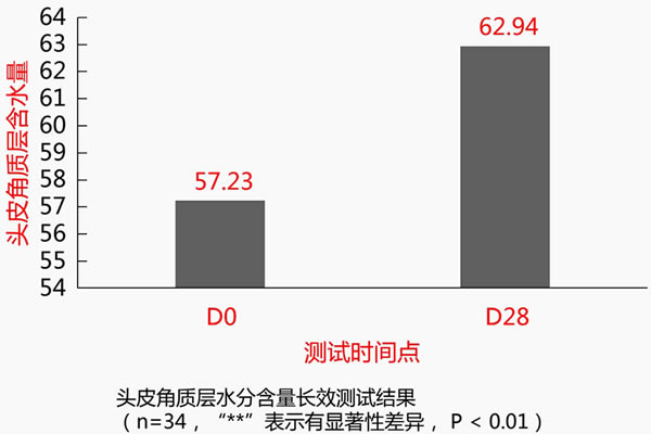 屏障修复:34人临床测试显示,使用28天后头皮角质层含水量提升9.98%
