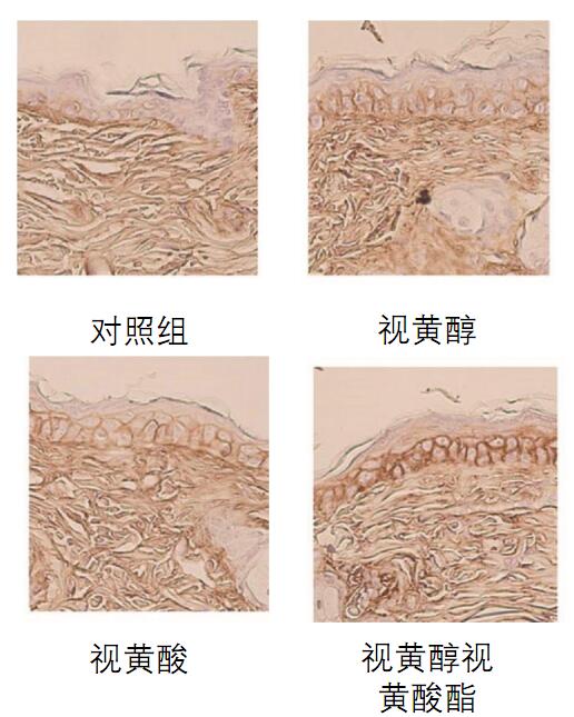 设置0.05%的视黄醇组、0.05% 视黄酸组、0.05%视黄醇视黄酸酯组和对照空白四组,用于脱毛处理后的小鼠皮肤,三天后观察小鼠组织切片中的表皮层和真皮层,透明质酸与蛋白(HABP)结合会有染色反应。(见下图)