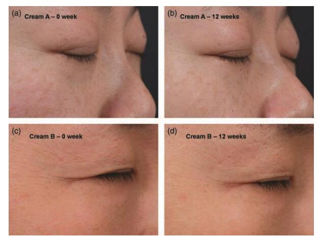 随机将受试者分成A、B两组,A组在眼周使用含0.06%视黄醇视黄酸酯的产品,B组使用含0.075%视黄醇的产品,每天早晚各一次;分别在测试的第4、8、12周对受试者进行回访,使用Visiometer SV 600(CK, Germany)记录受试者在不同测试阶段眼周皮肤状况。